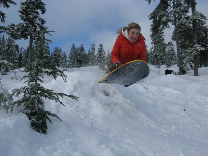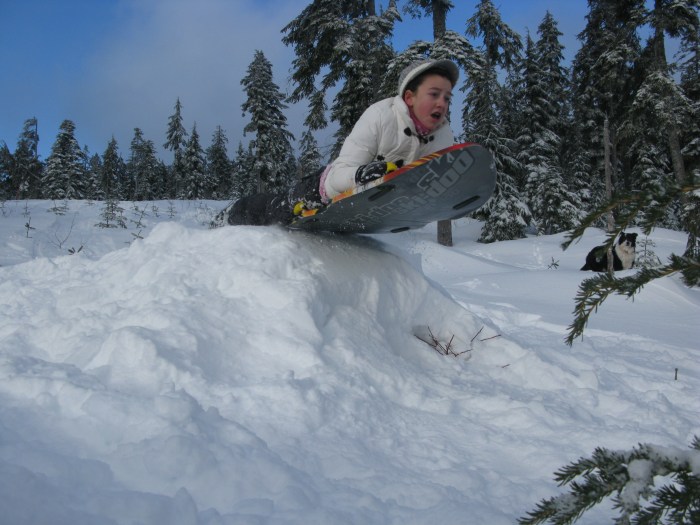 Closer to sea level, school fields are popular with the younger crowd. “The slope behind Gibsons elementary is good for younger kids and pretty good for building jumps,” says 12-year-old Kaishan Nonacowie. There’s also a gentle slope behind Elphinstone Secondary.