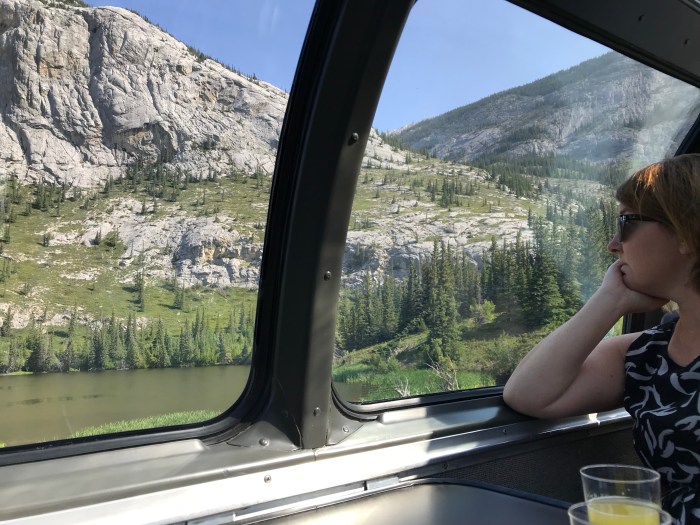 VIA Rail’s not quiet. There were times during the night that I thought a crash was imminent, such was the screeching on the rails. “You’ve got all day to nap,” I told myself as I opened the blind to see daybreak in the Rockies. Our attendant told us we’d made good time overnight, getting up to 80 kilometres an hour, which might have explained the noise.