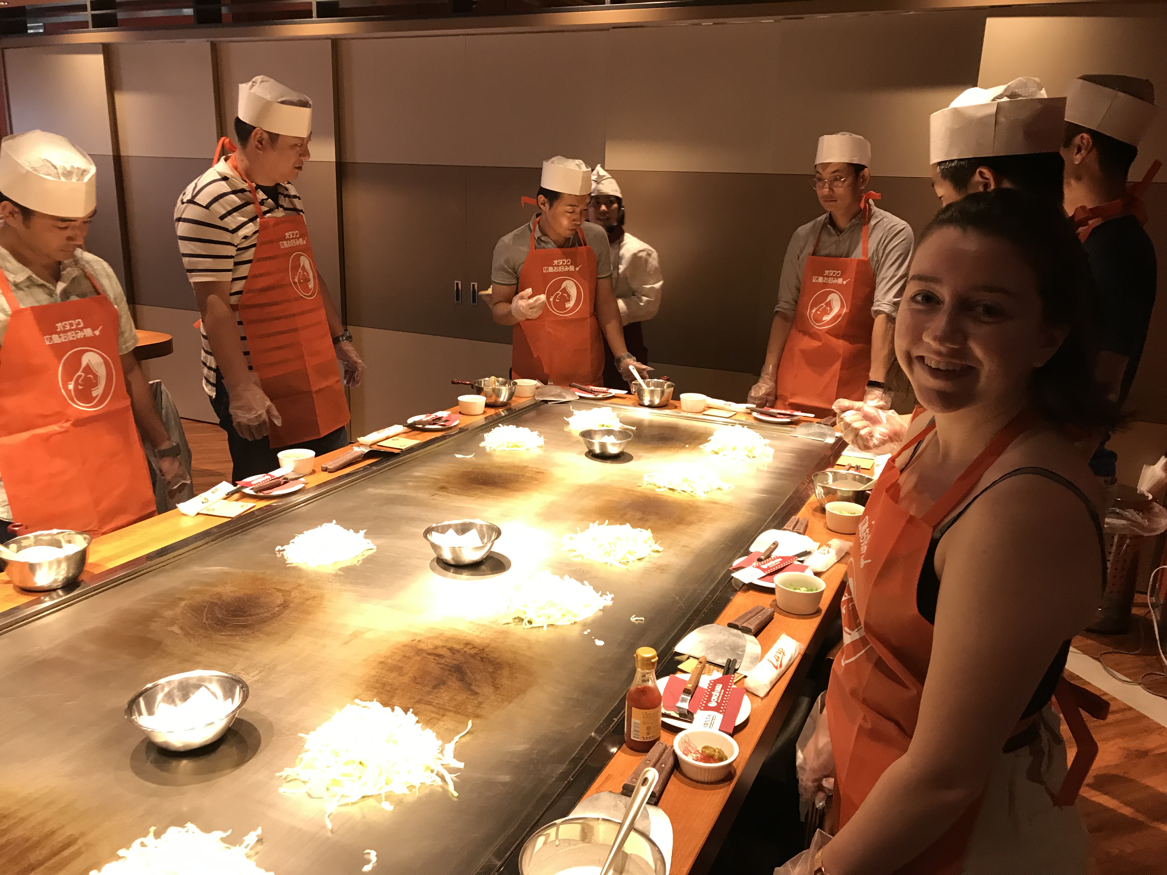 We signed up for a cooking class – aka the Standard Hiroshima Okonomiyaki Experience – at kitchens located near the city’s main train station. The space resembled a TV studio with bright lights and busy instructors wearing headsets and mics.