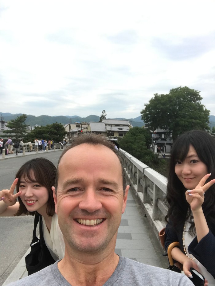We stretched our legs at Togetsu-kyo bridge, crossing the Katsura River in Arashiyama on the western fringe of Kyoto. Along with numerous temples, the area is home to a bamboo grove that dwarfs visitors who walk its trails. It’s also a few degrees cooler in there.