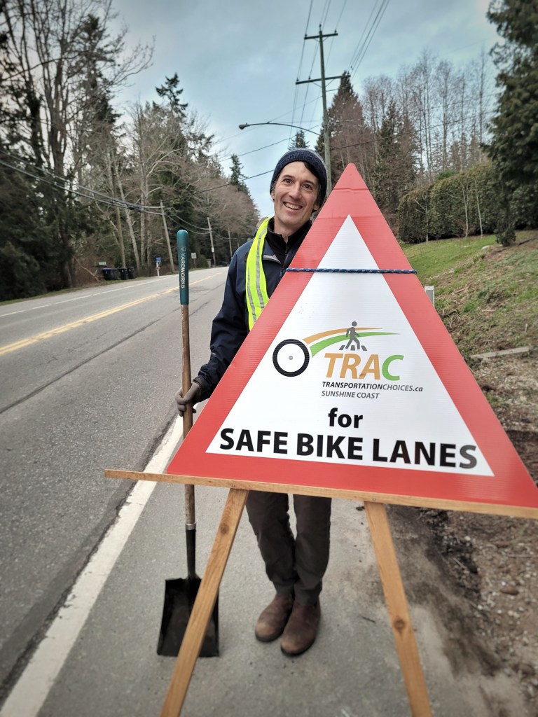 Commuting in the opposite direction for the last 20-plus years is Alun Woolliams, president of TraC (Transportation Choices Sunshine Coast – transportationchoices.ca). A volunteer member-based group, TraC encourages people to get out of their single-occupancy vehicles by changing local culture towards active transportation. It’s also about encouraging local and non-local governments (The provincial Ministry of Transportation and Infrastructure-MOTI) to improve infrastructure.
